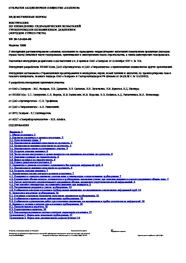 Наша цель состоит в том, чтобы предоставить вам быстрый доступ к содержанию документа Инструкция по проведению гидравлических испытаний трубопроводов повышенным давлением (методом стресс-теста).