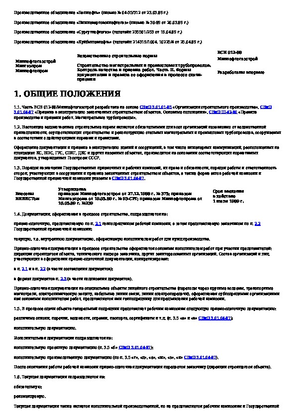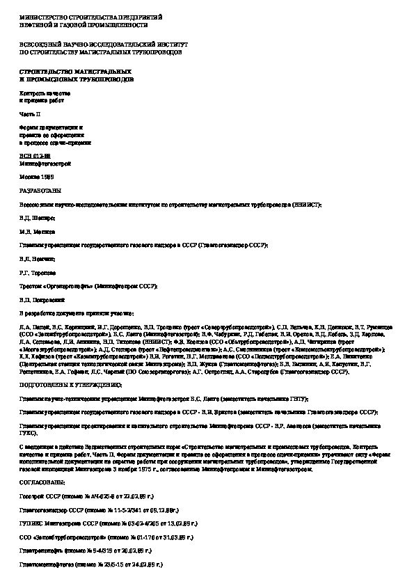 ВСН 012-88: Строительство магистральных и промысловых трубопроводов. Контроль качества и приемка работ. Часть II. Формы документации и правила