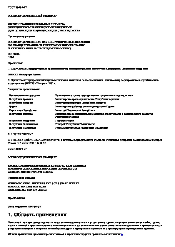 ГОСТ 30491-97: Смеси органоминеральные и грунты, укрепленные органическими вяжущими, для дорожного и аэродромного строительства. Технические ус