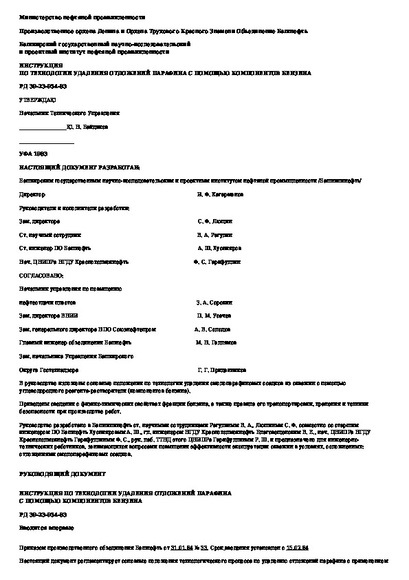 РД 39-23-954-83: Инструкция по технологии удаления отложений парафина с помощью компонентов бензина