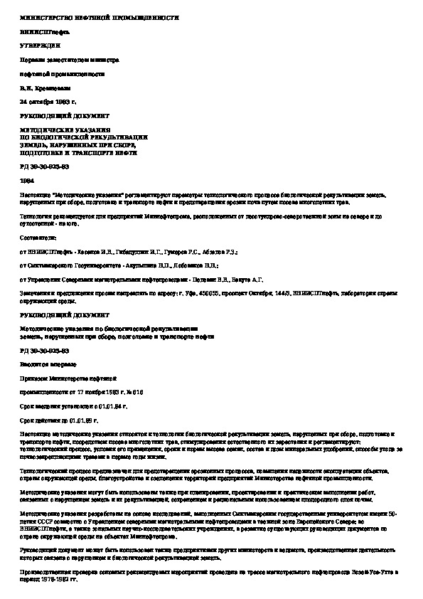 РД 39-30-925-83: Методические указания по биологической рекультивации земель, нарушенных при сборе, подготовке и транспорте нефти