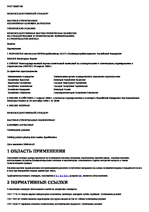 ГОСТ 30307-95: Мастики строительные полимерные клеящие латексные. Технические условия