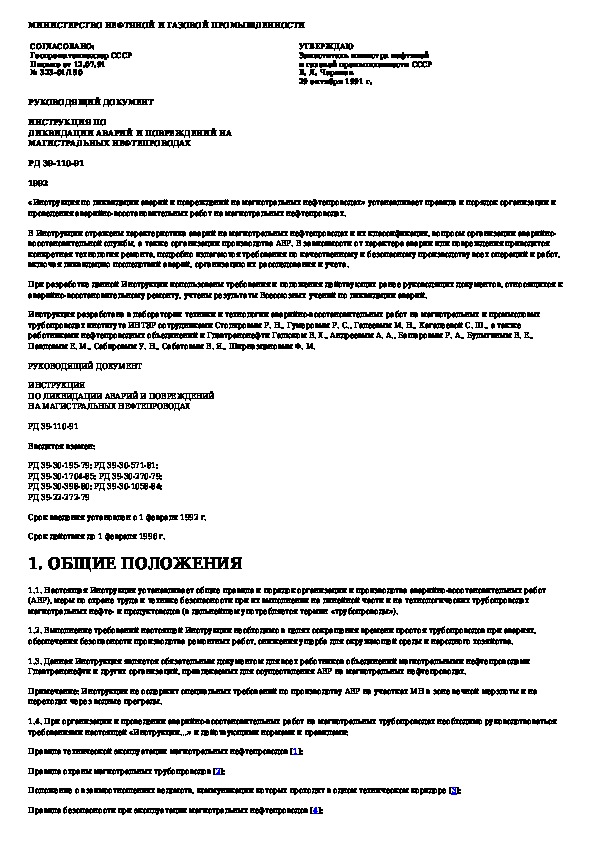 РД 39-110-91: Инструкция по ликвидации аварий и повреждений на магистральных нефтепроводах
