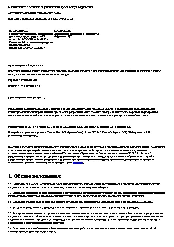 Наша цель состоит в том, чтобы предоставить вам быстрый доступ к содержанию документа Инструкция по рекультивации земель, нарушенных и загрязненных при аварийном и капитальном ремонте магистральных нефтепроводов.