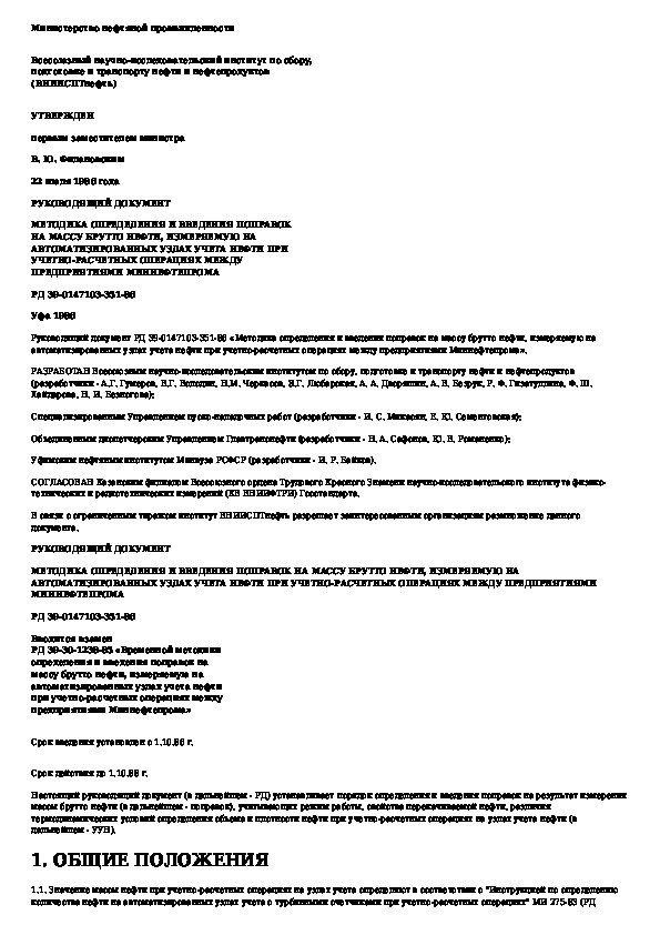 РД 39-0147103-351-86: Методика определения и введения поправок на массу брутто нефти, измеряемую на автоматизированных узлах учета нефти при учетно-рас
