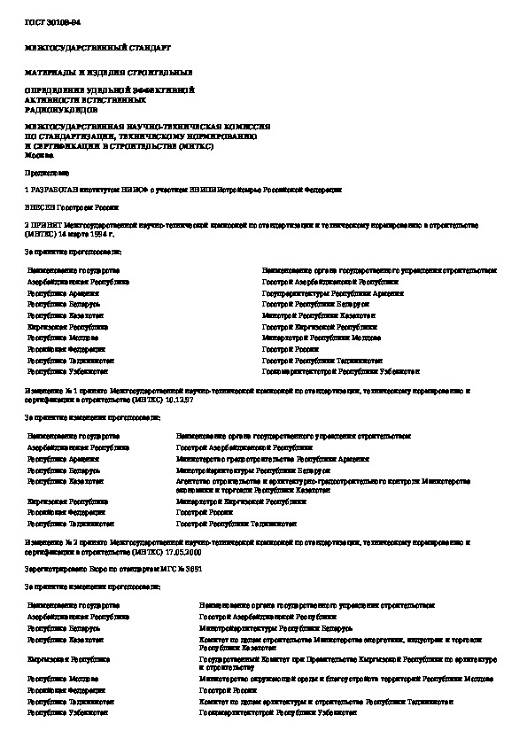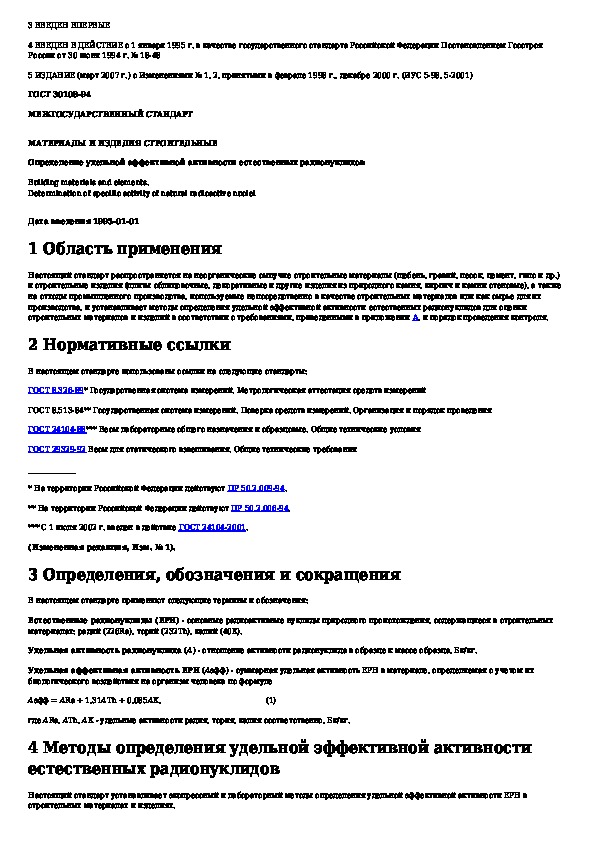 ГОСТ 30108-94: Материалы и изделия строительные. Определение удельной эффективной активности естественных радионуклидов