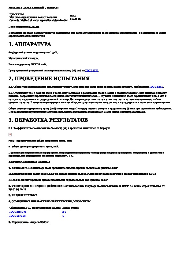 ГОСТ 310.6-85: Цементы. Метод определения водоотделения