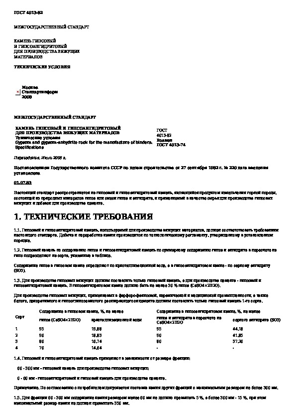 ГОСТ 4013-82: Камень гипсовый и гипсоангидритовый для производства вяжущих материалов. Технические условия