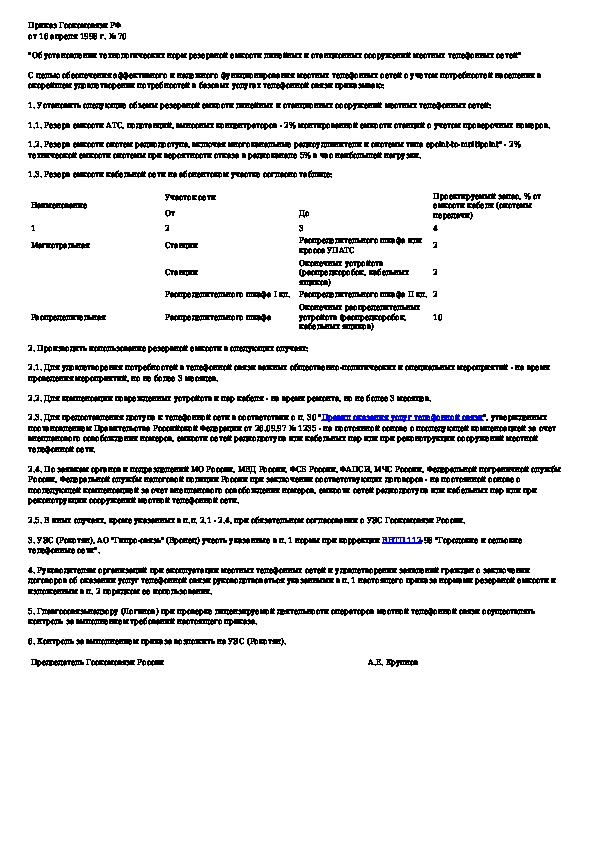 Приказ 70: Об установлении технологических норм резервной емкости линейных и станционных сооружений местных телефонных сетей