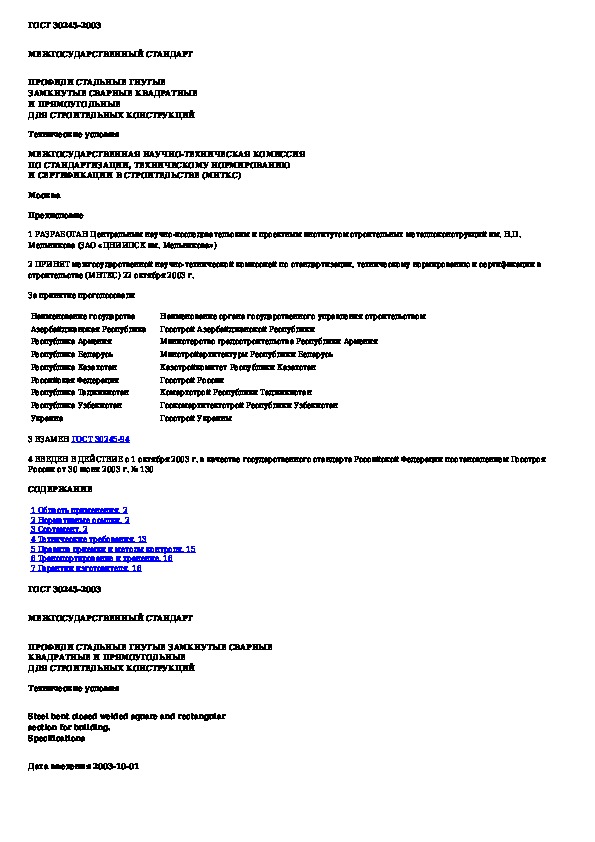 ГОСТ 30245-2003: Профили стальные гнутые замкнутые сварные квадратные и прямоугольные для строительных конструкций. Технические условия