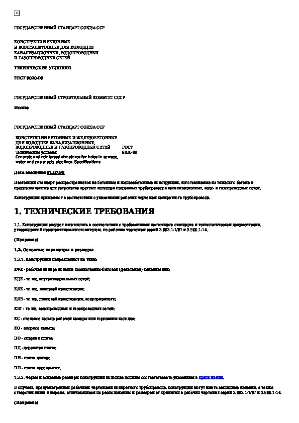 ГОСТ 8020-90: Конструкции бетонные и железобетонные для колодцев канализационных, водопроводных и газопроводных сетей. Технические условия