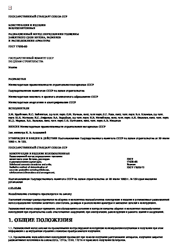 ГОСТ 17625-83: Конструкции и изделия железобетонные. Радиационный метод определения толщины защитного слоя бетона, размеров и расположения арма