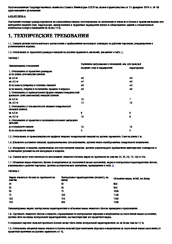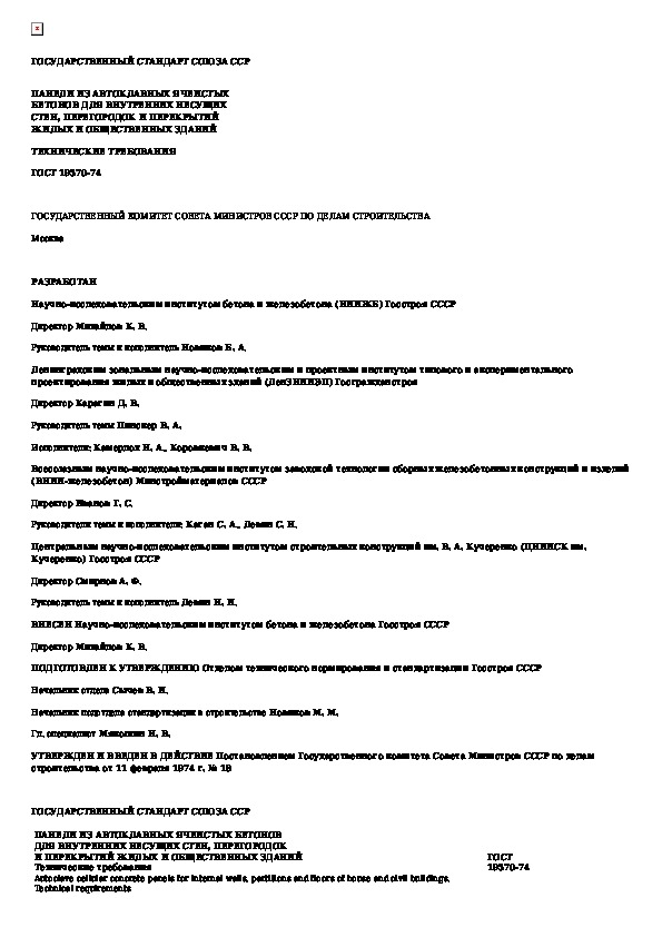 ГОСТ 19570-74: Панели из автоклавных ячеистых бетонов для внутренних несущих стен, перегородок и перекрытий жилых и общественных зданий. Техниче