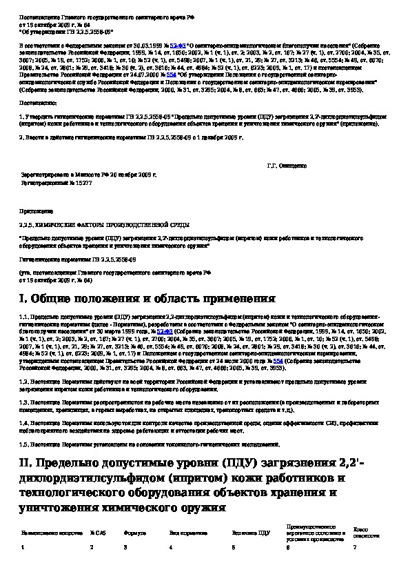ГН 2.2.5.2558-09: Предельно допустимые уровни (ПДУ) загрязнения 2,2'-дихлордиэтилсульфидом (ипритом) кожи работников и технологического оборудования