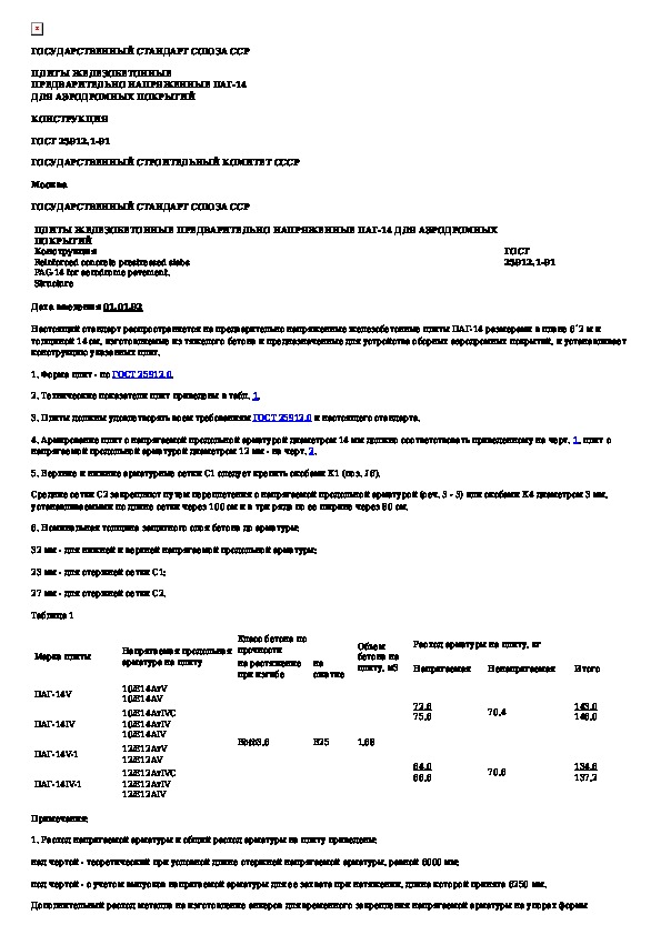 ГОСТ 25912.1-91: Плиты железобетонные предварительно напряженные ПАГ-14 для аэродромных покрытий. Конструкция