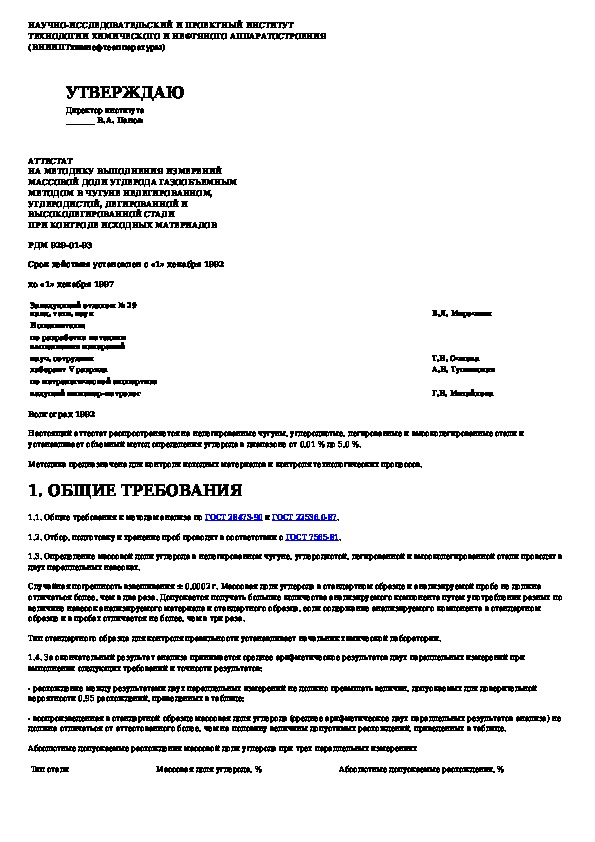 РДМ 929-01-93: Аттестат на методику измерений массовой доли углерода газообменным методом в чугуне нелегированном, углеродистой, легированной и