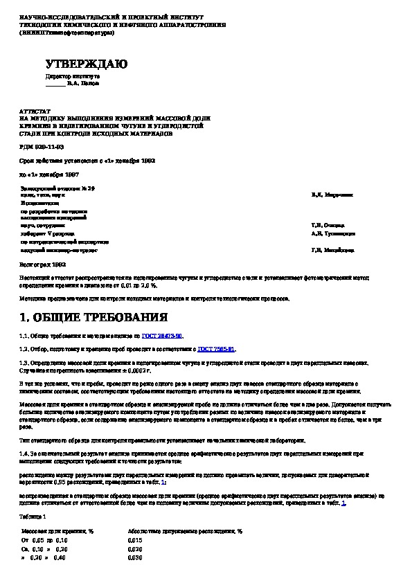 Аттестат на методику выполнения измерений массовой доли кремния в нелегированном чугуне и углеродистой стали при контроле исходн