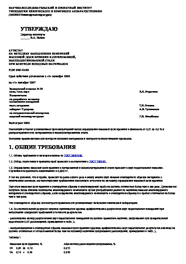 Аттестат на методику выполнения измерений массовой доли кремния в легированной, высоколегированной стали при контроле исходных м