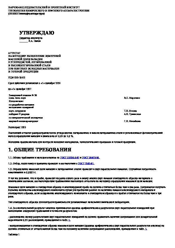 РДМ 929-18-93: Аттестат на методику выполнения измерений массовой доли ванадия в углеродистой, легированной и высоколегированной стали при конт