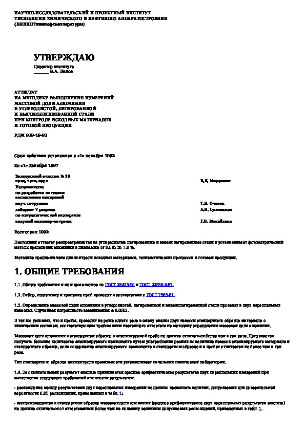 РДМ 929-19-93: Аттестат на методику выполнения измерений массовой доли алюминия в углеродистой, легированной и высоколегированной стали при кон