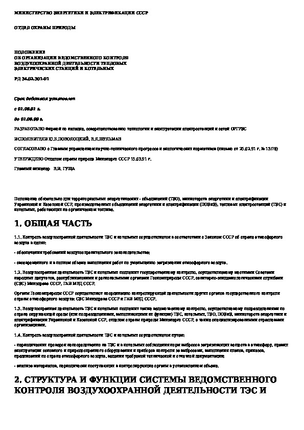 Положение об организации ведомственного контроля воздухоохранной деятельности тепловых электрических станций и котельных