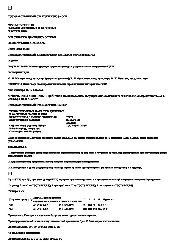 Наша цель состоит в том, чтобы предоставить вам быстрый доступ к содержанию документа Трубы чугунные канализационные и фасонные части к ним. Крестовины двухплоскостные. Конструкция и размеры.