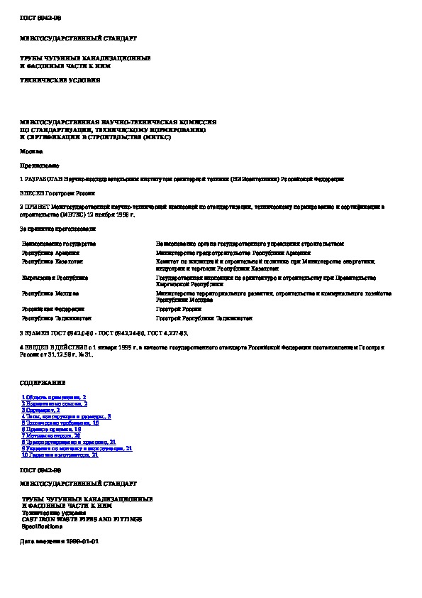 ГОСТ 6942-98: Трубы чугунные канализационные и фасонные части к ним. Технические условия