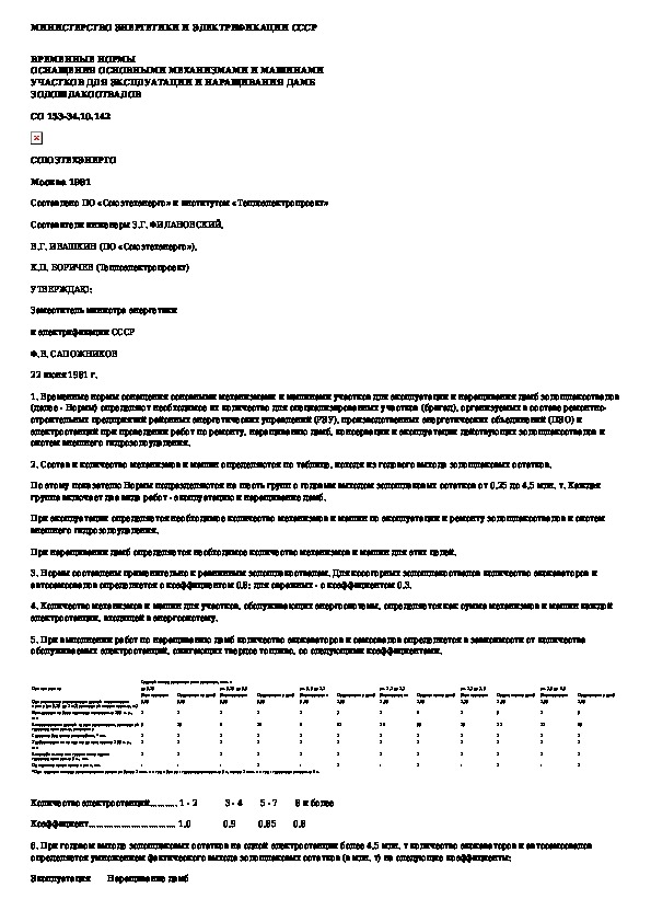 СО 153-34.10.142: Временные нормы оснащения основными механизмами и машинами участков для эксплуатации и наращивания дамб золошлакоотвалов