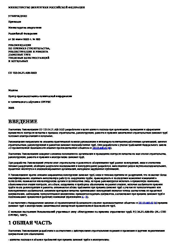 СО 153-34.21.408-2003: Рекомендации по приемке строительства, реконструкции и ремонта дымовых труб тепловых электростанций и котельных