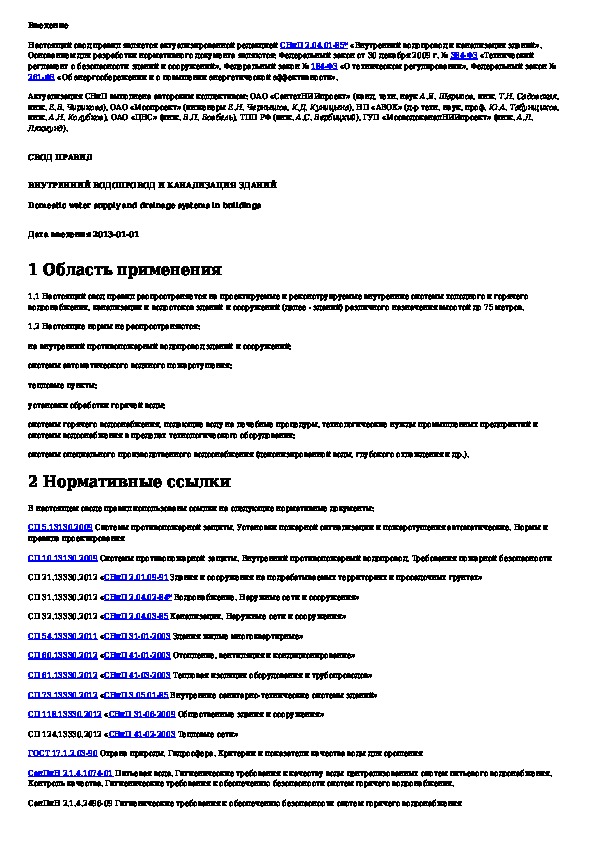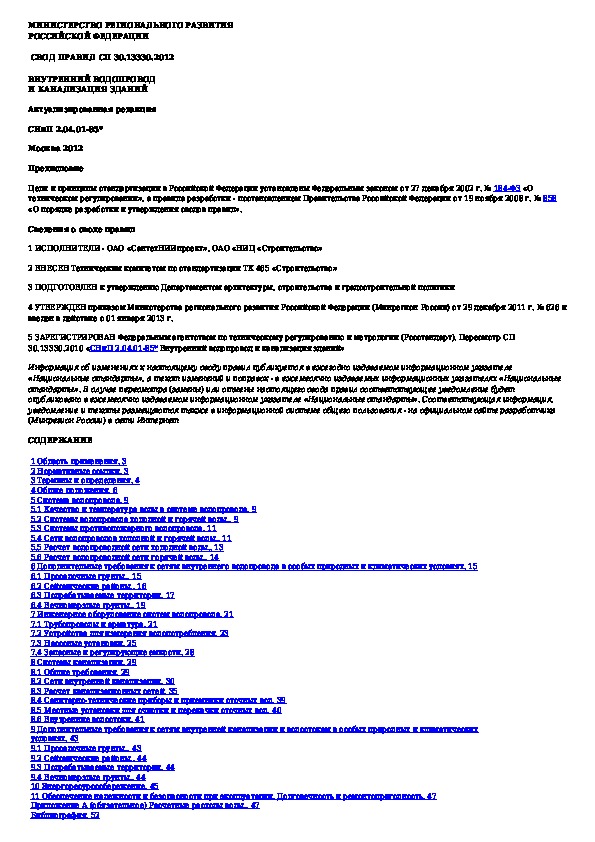 СП 30.13330.2012: Внутренний водопровод и канализация зданий