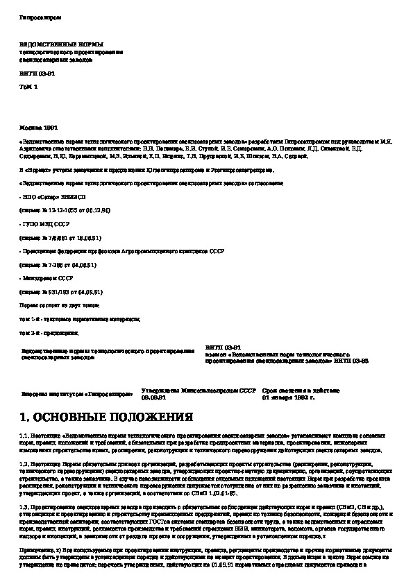 Ведомственные нормы технологического проектирования свеклосахарных заводов. Том 1