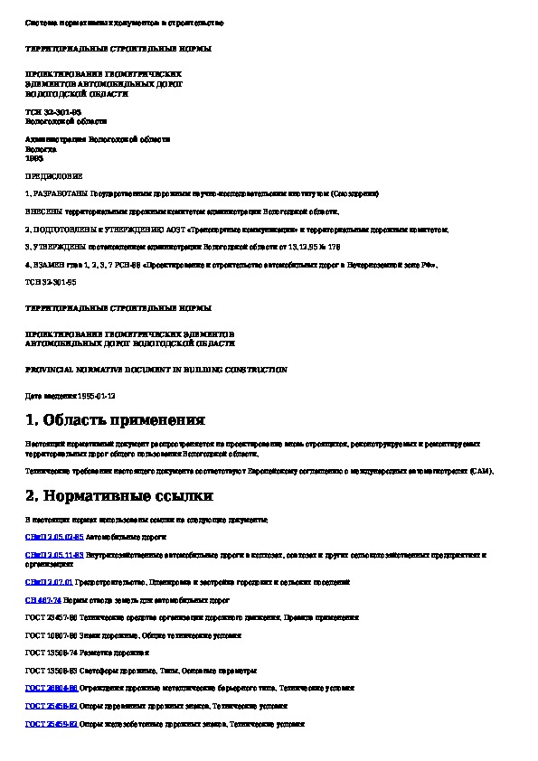 ТСН 32-301-95: Проектирование геометрических элементов автомобильных дорог Вологодской области