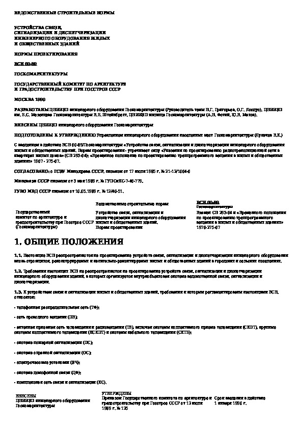 ВСН 60-89: Устройства связи, сигнализации и диспетчеризации инженерного оборудования жилых и общественных зданий. Нормы проектирования