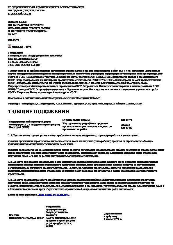СН 47-74: Инструкция по разработке проектов организации строительства и проектов производства работ