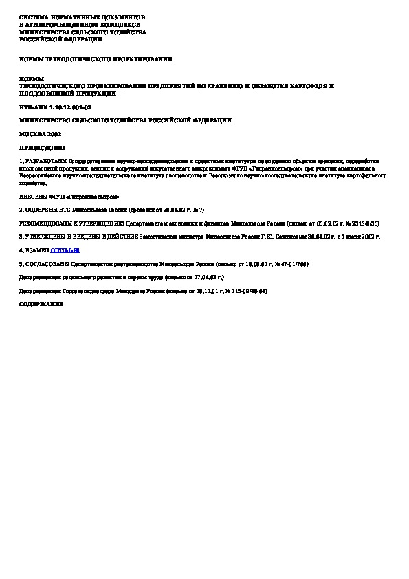 НТП АПК 1.10.12.001-02: Нормы технологического проектирования предприятий по хранению и обработке картофеля и плодоовощной продукции
