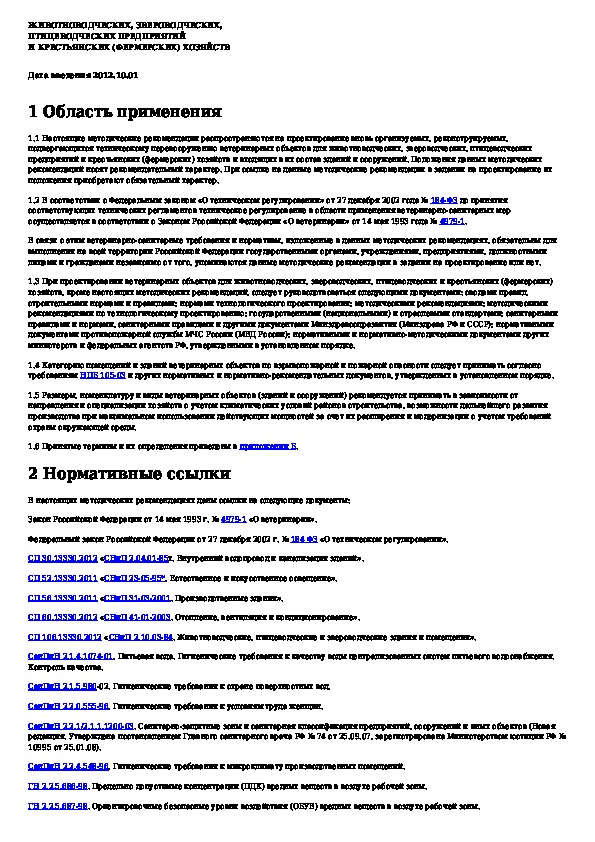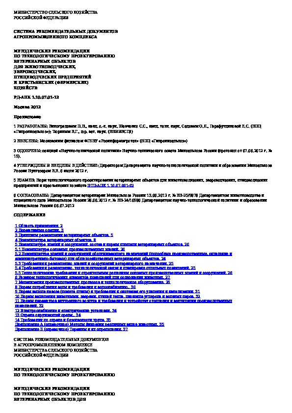 РД-АПК 1.10.07.01-12: Методические рекомендации по технологическому проектированию ветеринарных объектов для животноводческих, звероводческих, птице