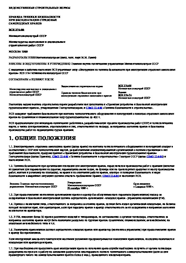 ВСН 274-88: Правила техники безопасности при эксплуатации стреловых самоходных кранов