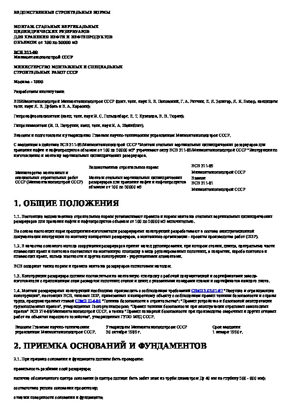 ВСН 311-89: Монтаж стальных вертикальных цилиндрических резервуаров для хранения нефти и нефтепродуктов объемом от 100 до 50000 м3