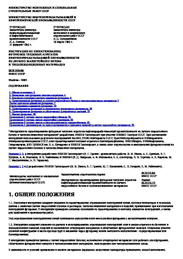 ВСН 315-80: Инструкция по проектированию футеровок тепловых агрегатов нефтеперерабатывающей промышленности из легкого жаростойкого бетона