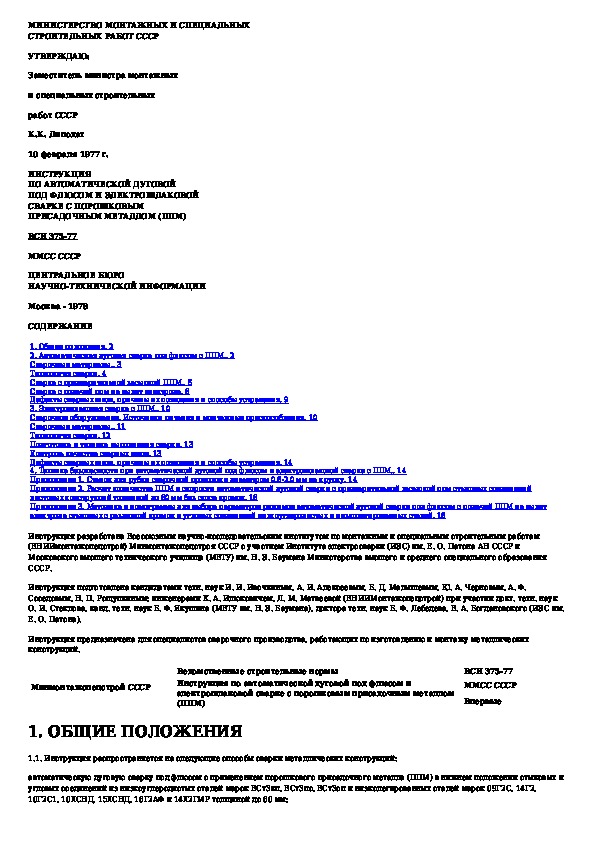 ВСН 375-77: Инструкция по автоматической дуговой под флюсом и электрошлаковой сварке с порошковым присадочным металлом (ППМ)