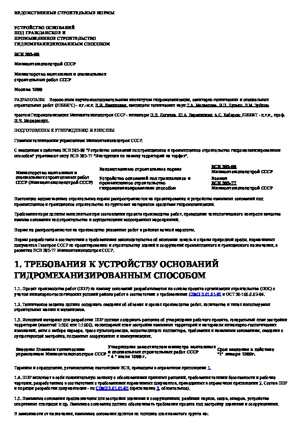 ВСН 385-88: Устройство оснований под гражданское и промышленное строительство гидромеханизированным способом
