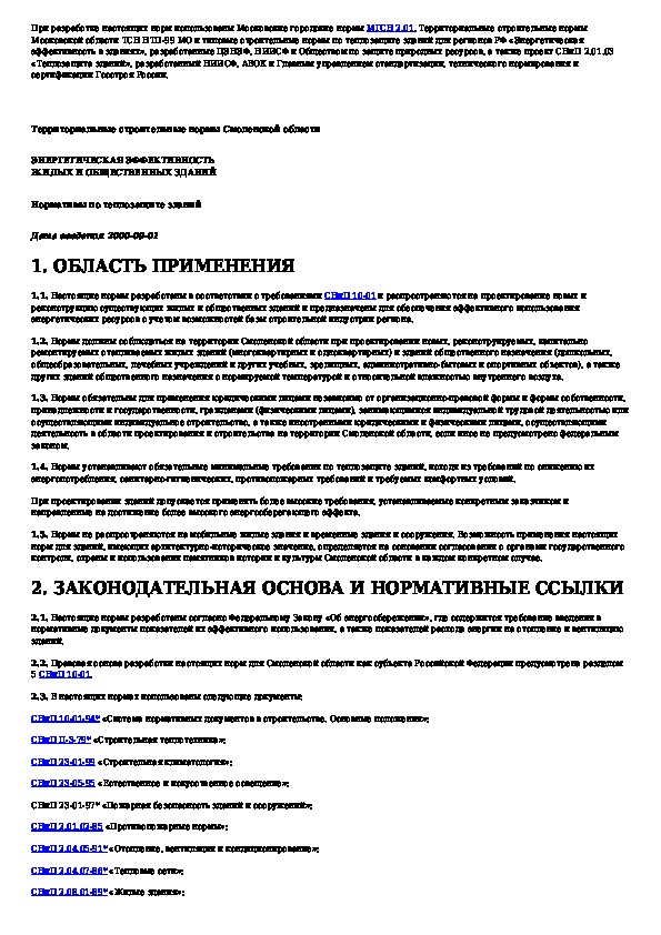 Энергетическая эффективность жилых и общественных зданий. Нормативы по теплозащите зданий. Смоленская область