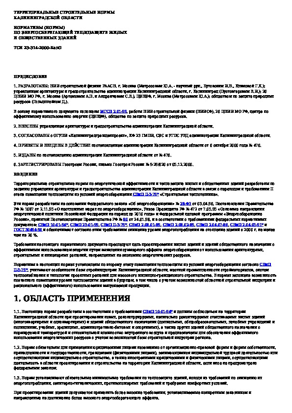 ТСН 23-314-2000: Нормативы (нормы) по энергосберегающей теплозащите жилых и общественных зданий. Калининградская область