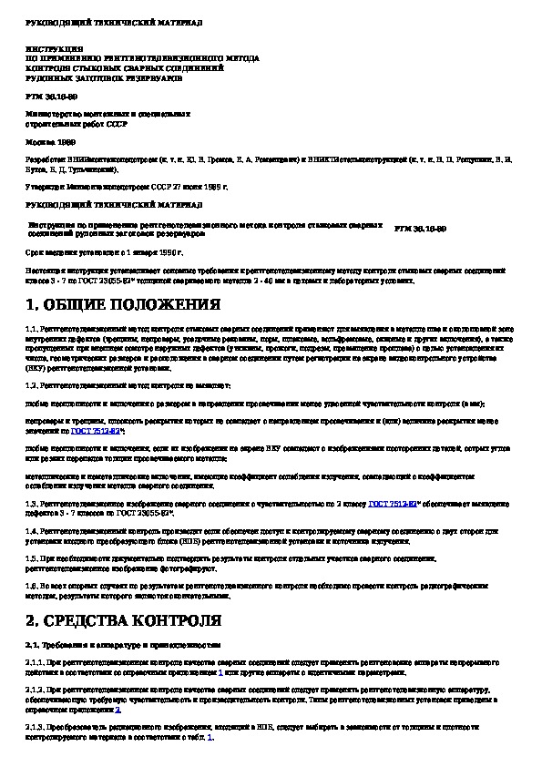 РТМ 36.16-89: Инструкция по применению рентгенотелевизионного метода контроля стыковых сварных соединений рулонных заготовок резервуаров