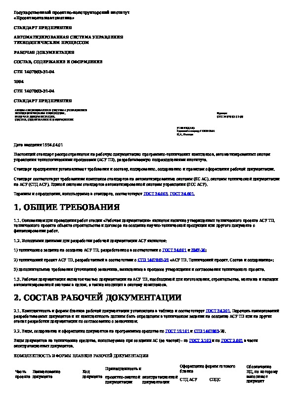 СТП 1407863-31-94: Автоматизированная система управления технологическим процессом. Рабочая документация. Состав, содержание и оформление