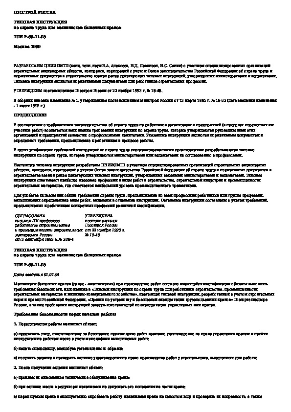 ТОИ Р-66-11-93: Типовая инструкция по охране труда для машинистов башенных кранов