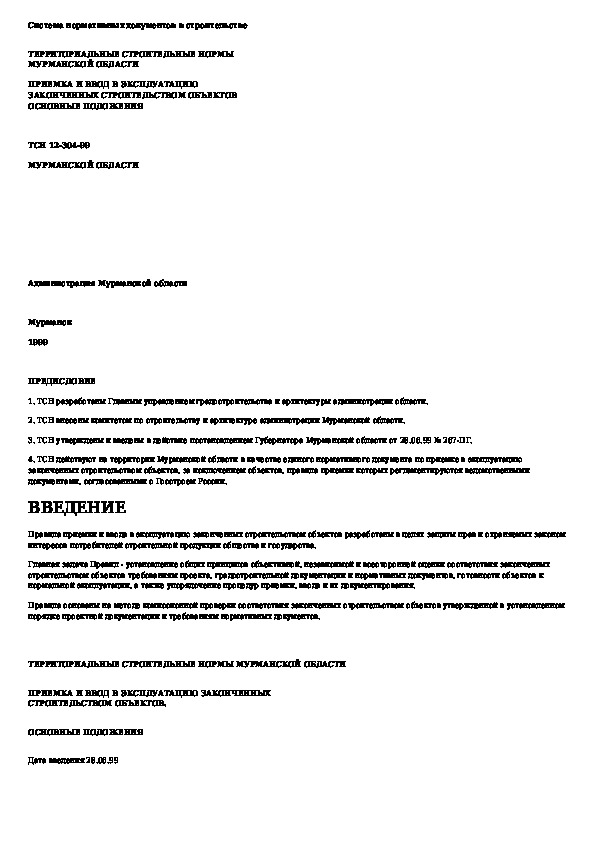 ТСН 12-304-99: Приемка и ввод в эксплуатацию законченных строительством объектов. Основные положения. Мурманская область