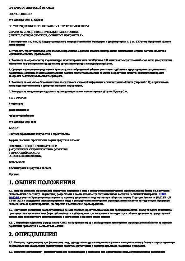 ТСН 12-307-99: Приемка и ввод в эксплуатацию законченных строительством объектов. Основные положения. Иркутская область