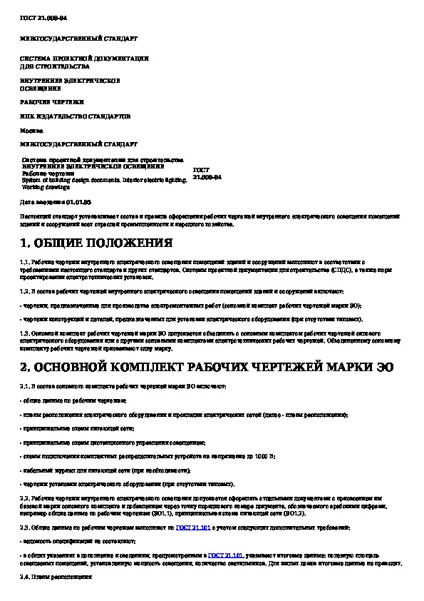 ГОСТ 21.608-84: Система проектной документации для строительства. Внутреннее электрическое освещение. Рабочие чертежи