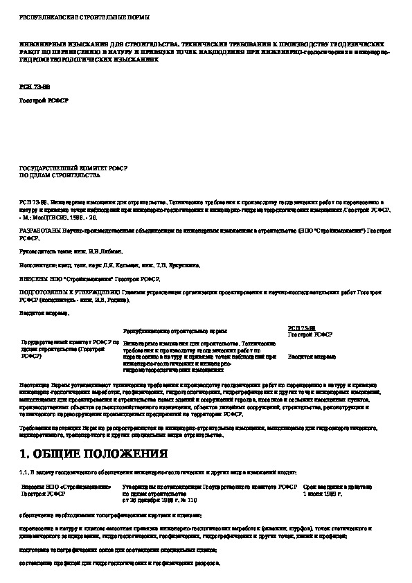 РСН 73-88: Инженерные изыскания для строительства. Технические требования к производству геодезических работ по перенесению в натуру и прив
